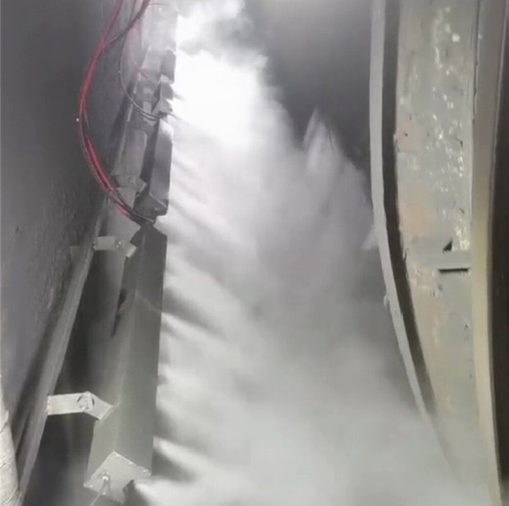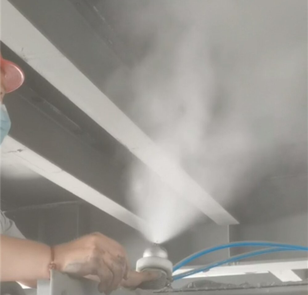 干霧抑塵裝置是由壓縮水源驅動聲波震蕩器,通過高頻聲波的音爆作用在噴頭共振處將水高度霧化,產生10微米以下的微細水霧顆粒(直徑小于10微米的稱為干霧)噴向起塵點,···